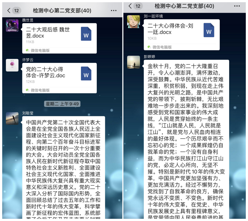 為全面學(xué)習(xí)宣傳貫徹黨的二十大精神,引導(dǎo)職工將黨的二十大精神轉(zhuǎn)化為指導(dǎo)實(shí)踐、推動(dòng)工作的強(qiáng)大動(dòng)力,檢測中心第二黨支部近日開展“學(xué)習(xí)二十大 助力新征程”主題黨日活動(dòng),整理二十大相關(guān)資料利用視頻會(huì)議進(jìn)行學(xué)習(xí),同時(shí)結(jié)合線下自學(xué),黨員和積極分子撰寫了學(xué)習(xí)心得感悟35篇。