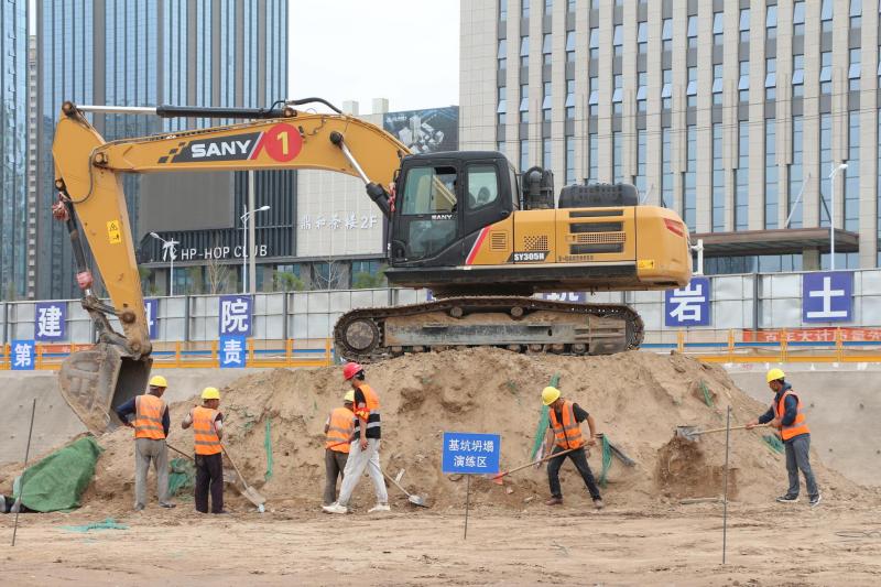 上午10時整,隨著王春景一聲令下,各作業(yè)區(qū)、部室及演練人員迅速到達指定區(qū)域開始模擬基坑塌陷演練。其設(shè)置情景是:勞務(wù)作業(yè)人員在現(xiàn)場作業(yè)期間發(fā)生土方塌方,該班組安全員發(fā)現(xiàn)了該作業(yè)人員被掩埋,立即上前進行施救,并快速將人員信息傳送至項目部應(yīng)急領(lǐng)導(dǎo)小組,報告塌方事故的時間、地點等信息。現(xiàn)場指揮根據(jù)事故情況宣布啟動應(yīng)急預(yù)案,立即通知項目部醫(yī)療小組、安全小組帶上擔架、藥箱、警戒線立刻趕往現(xiàn)場準備警戒施救工作,通知救護車輛進場待命。