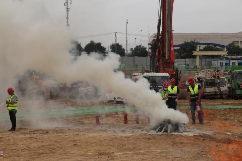隨后,進行了火災(zāi)演練:存放材料倉庫突然濃煙滾滾,火苗四竄,現(xiàn)場情況十分危急。工人從現(xiàn)場逃生,現(xiàn)場安全員第一時間向消防報警,并向項目負責人和建設(shè)單位領(lǐng)導(dǎo)報告,應(yīng)急指揮部立即啟動應(yīng)急預(yù)案,做出滅火救援部署。技術(shù)和救援小組第一時間到達現(xiàn)場進行救援,使用干粉滅火器及消防用水滅火,安全警戒組立即對著火點設(shè)置警戒線,防止其他工人進入危險地帶。