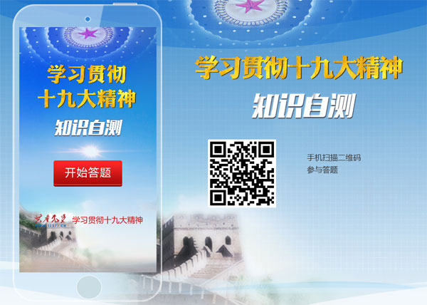 網(wǎng)友可登錄共產(chǎn)黨員網(wǎng)首頁(yè),進(jìn)入“學(xué)習(xí)貫徹十九大精神知識(shí)自測(cè)”專(zhuān)區(qū)進(jìn)行答題,或者通過(guò)手機(jī)掃描二維碼參與答題。