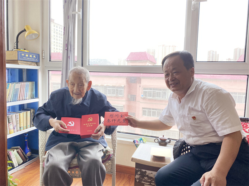 紀(jì)委書(shū)記、工會(huì)主席閻新明及機(jī)關(guān)部室相關(guān)負(fù)責(zé)人走訪(fǎng)慰問(wèn)了黨齡50年的100歲離休黨員薛篤昶老人。由于百歲老人薛老與中國(guó)共產(chǎn)黨同壽,“雙百”可謂錦上添花,好事成雙。當(dāng)閻新明將“光榮在黨50周年”紀(jì)念章頒發(fā)給薛老時(shí),老人滿(mǎn)含熱淚表達(dá)了對(duì)中國(guó)共產(chǎn)黨的感恩和對(duì)公司各位領(lǐng)導(dǎo)的真誠(chéng)感謝。薛老激動(dòng)地說(shuō)到:“與黨同齡,是我一生之幸!”
