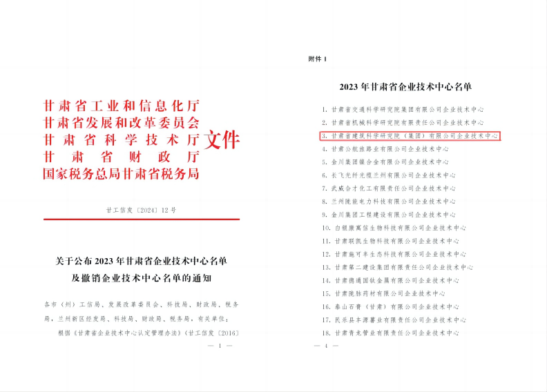 近日,從甘肅省工信廳獲悉,甘肅建科院成功獲批甘肅省企業(yè)技術(shù)中心。此次甘肅建科院獲批省級企業(yè)技術(shù)中心,是政府行業(yè)主管部門對公司創(chuàng)新能力及創(chuàng)新成果的肯定,代表著公司科技創(chuàng)新水平與科技創(chuàng)新實力處于省內(nèi)行業(yè)領(lǐng)先地位,標志著公司品牌形象及綜合實力再上新臺階。