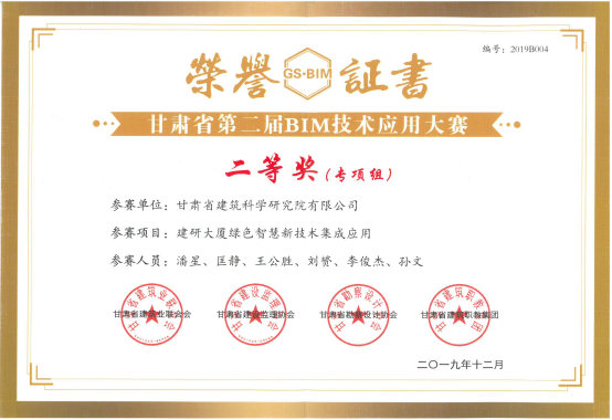 大會(huì)為省建科院頒發(fā)了甘肅省第二屆 BIM 技術(shù)應(yīng)用大賽專(zhuān)項(xiàng)組二等獎(jiǎng)榮譽(yù)證書(shū)。由甘肅省建筑業(yè)聯(lián)合會(huì)、甘肅省勘察設(shè)計(jì)協(xié)會(huì)、甘肅省建設(shè)監(jiān)理協(xié)會(huì)、甘肅省建筑職教集團(tuán)、甘肅建筑職業(yè)技術(shù)學(xué)院、甘肅益埃畢建筑科技有限公司共同舉辦的甘肅省第二屆 BIM 技術(shù)應(yīng)用大賽,旨在進(jìn)一步促進(jìn) BIM 技術(shù)在我省工程建設(shè)領(lǐng)域的普及應(yīng)用,鼓勵(lì)創(chuàng)新實(shí)踐,弘揚(yáng)創(chuàng)新文化,加速建筑類(lèi)高校 BIM人才培養(yǎng)。在本次大賽中,省建科院“建研大廈綠色智慧新技術(shù)集成應(yīng)用”項(xiàng)目通過(guò)初審、終審答辯等環(huán)節(jié),獲得了專(zhuān)項(xiàng)組二等獎(jiǎng)。