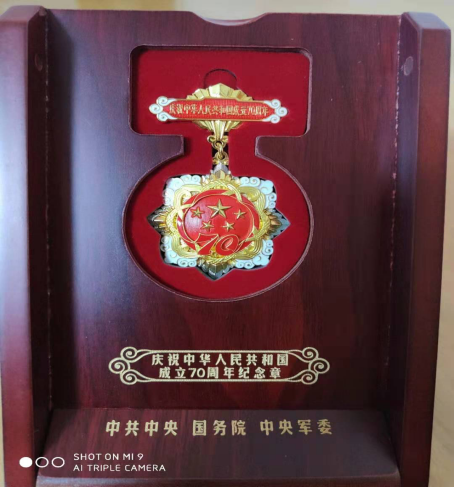 在新中國成立70周年之際,中共中央、國務院、中央軍委決定頒發(fā) “慶祝中華人民共和國成立70周年”紀念章。紀念章使用銅胎鍍金材質(zhì),主要元素為五星、“70”飄帶、團錦結(jié)、如意祥云和光芒,主色調(diào)為紅色和金色。核心部分為五星,代表國家榮譽?!?0”飄帶象征中華人民共和國70年奮斗歷程。團錦結(jié)環(huán)繞在五星和“70”飄帶周圍,寓意全國各族人民大團結(jié),構(gòu)建人類命運共同體的愿景。章體外環(huán)以如意祥云、光芒構(gòu)成,象征人民對美好生活的向往,同時表達隆重慶祝中華人民共和國生日,禮贊國家富強、民族振興、人民幸福的輝煌成就,以及在70年輝煌奮斗成就的基礎上不忘初心、繼續(xù)前進的堅定決心。