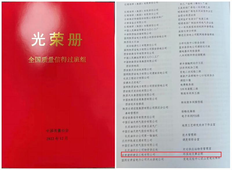 近日,在中國質(zhì)量協(xié)會(huì)2022年“全國質(zhì)量信得過班組”建設(shè)推進(jìn)活動(dòng)中,甘肅建研建設(shè)工程有限公司環(huán)保地災(zāi)事業(yè)部經(jīng)過層層選拔,繼獲得“甘肅省質(zhì)量信得過班組”榮譽(yù)后,又榮獲“2022年全國質(zhì)量信得過班組”。