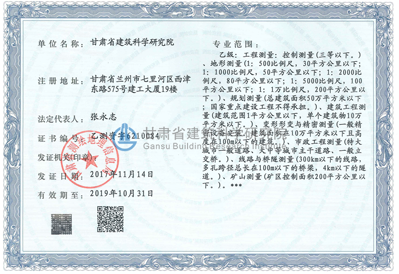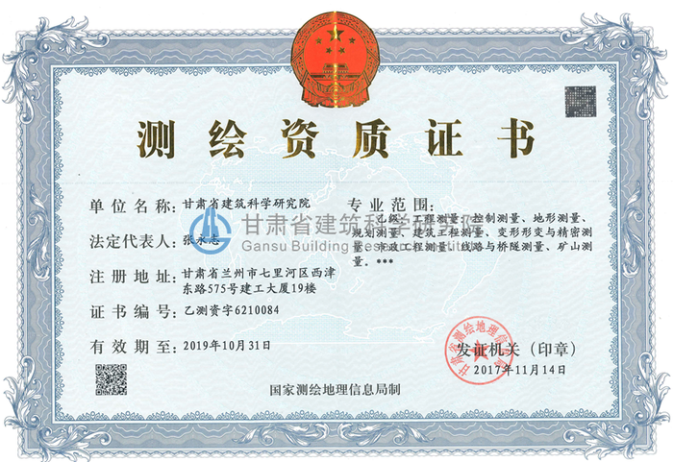 日前,從甘肅省測(cè)繪地理信息局傳來(lái)喜訊,我院測(cè)繪資質(zhì)(工程測(cè)量)丙級(jí)升乙級(jí)順利通過(guò)審核,取得測(cè)繪乙級(jí)(工程測(cè)量)資質(zhì)證書,這標(biāo)志著我院在工程測(cè)量方面的業(yè)務(wù)范圍進(jìn)一步拓展,專業(yè)能力及水平進(jìn)一步提升。