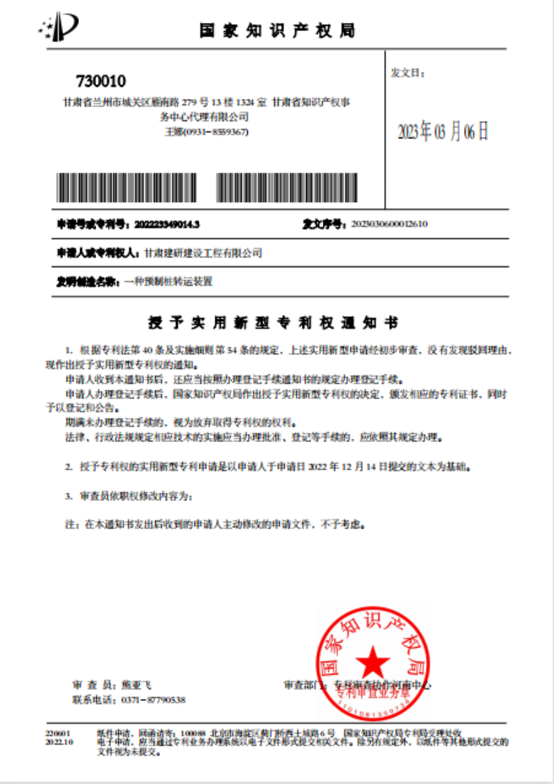 2023年一季度,經(jīng)國家知識產(chǎn)權(quán)局審核批準,建研建設(shè)公司申報的“一種梁粘鋼加固加壓裝置”“一種既有混凝土結(jié)構(gòu)增層節(jié)點”和“一種預(yù)制樁轉(zhuǎn)運裝置”三項實用新型專利獲得授權(quán)。截止目前,建研建設(shè)公司已授權(quán)發(fā)明專利2項、實用新型專利20余項,在審發(fā)明專利2項。